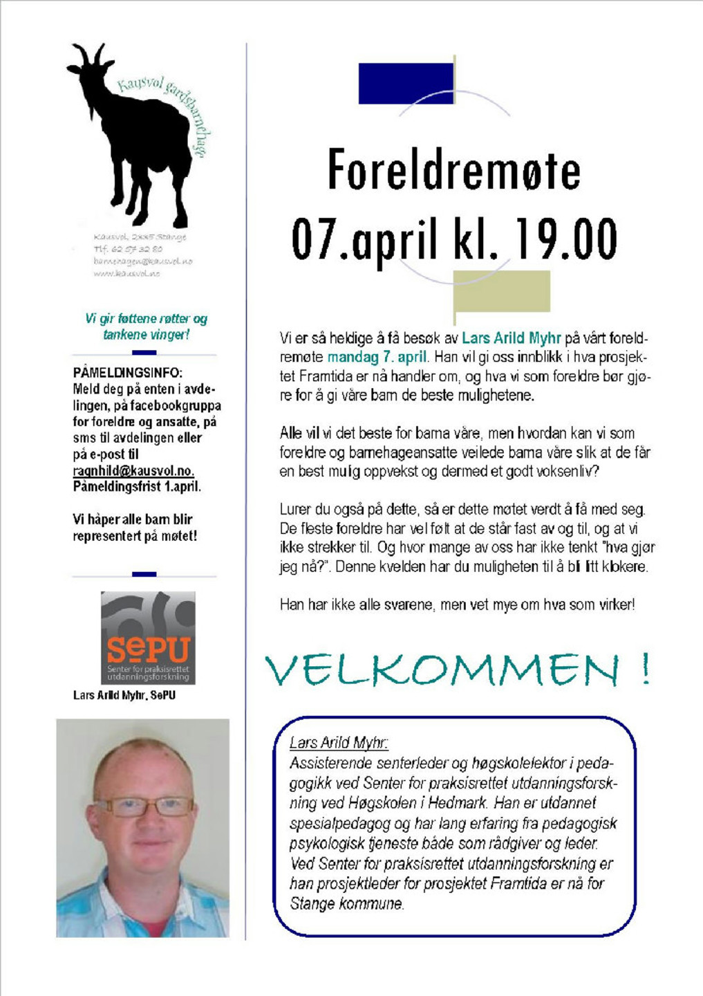 Både foreldre og ansatte er målgruppe for vårmøtet i barnehagen. Vi har fått Lars Myhr fra Senter for praksisrettet utdanningsforskning. Han har faglig ansvar for prosjektet Framtida er nå som omfatter alle barnehager og skoler i Stange. Påmelding innen 1. april i avdelingene eller på den lukkede facebookgruppa for ansatte og foreldre.