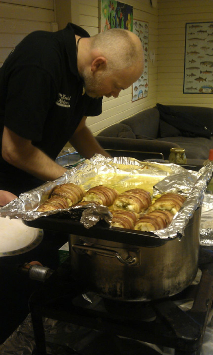 Breiflabbfileten snittes, fylles med pesto og rulles i Parmaskinke. Brunes i panne med smør