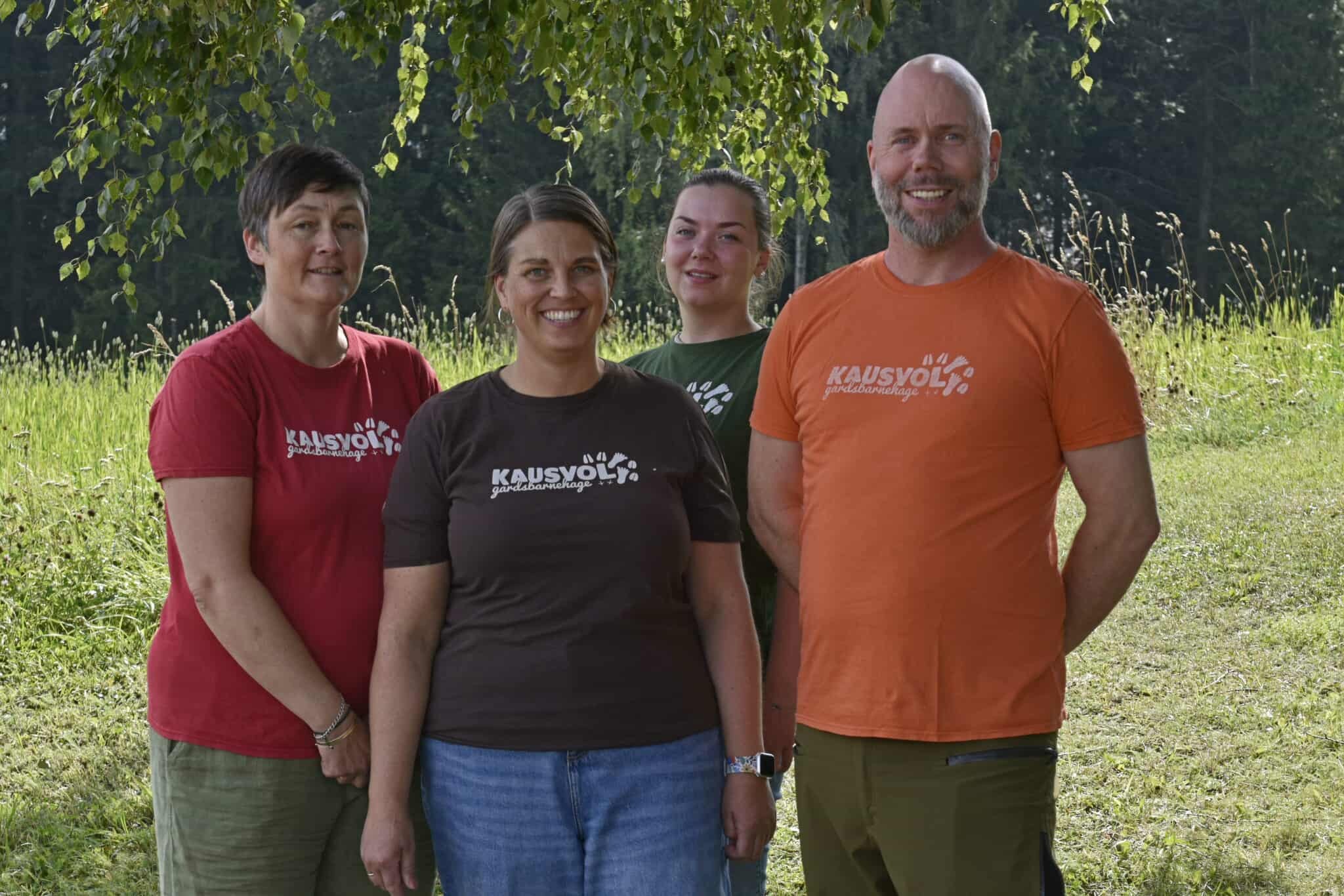 Lønn består av 24 barn og Bente er avdelingsleder, Nine er pedleder for skolegruppa, Iselin og Stig er fagarbeidere.